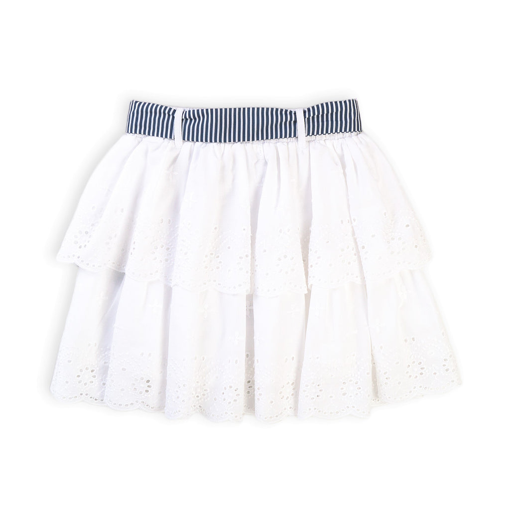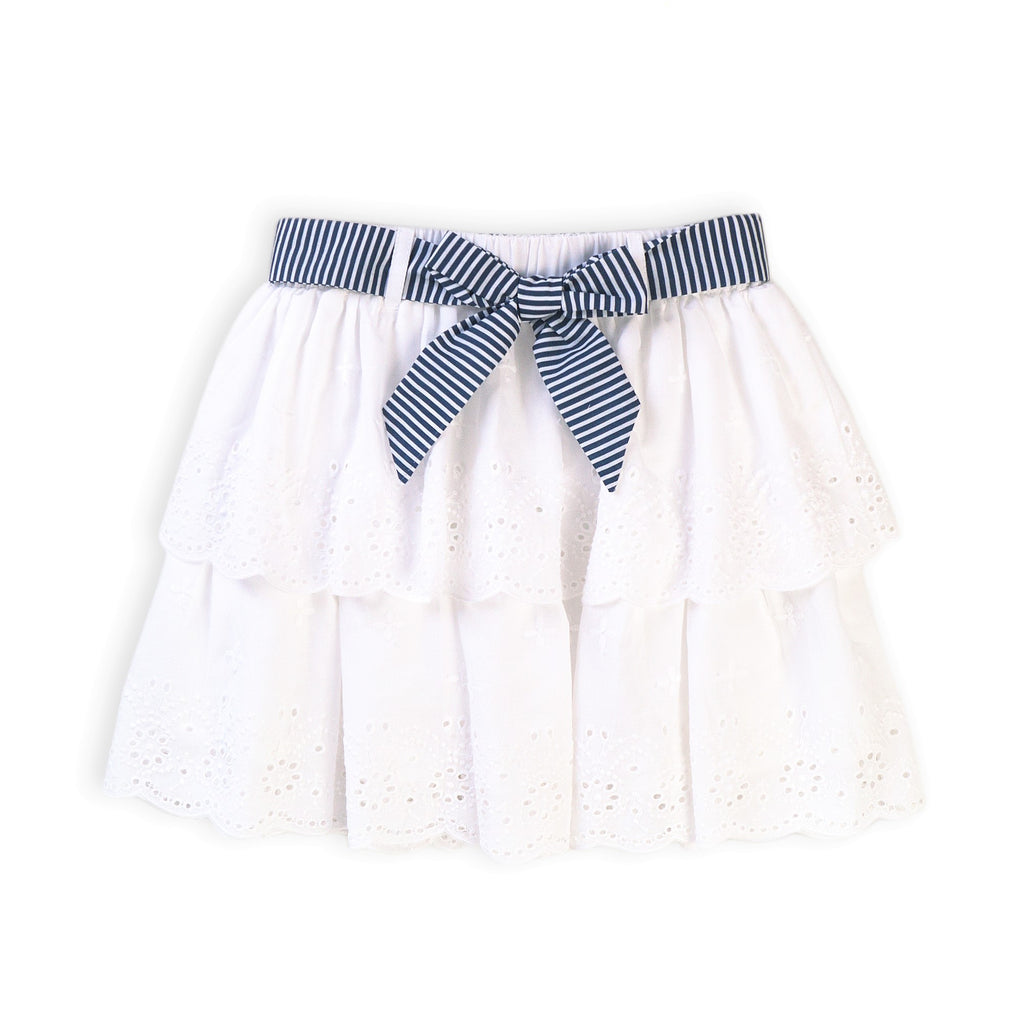 Two tier embroidred eyelet skirt with blue and white striped belt.