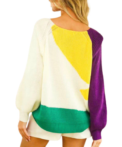 V-neck long sleeve cable knit sweater with artistic pattern color block on back