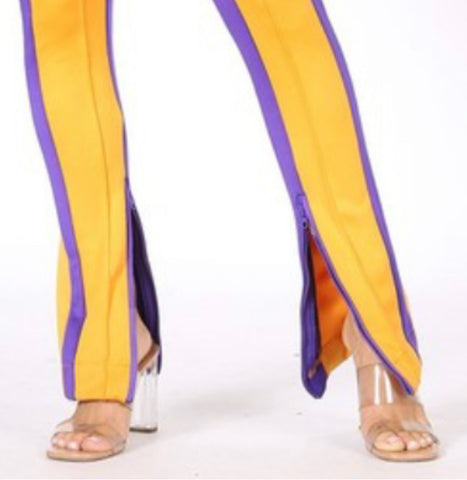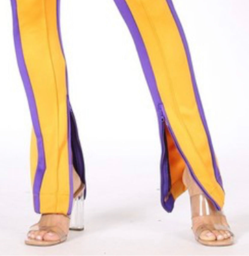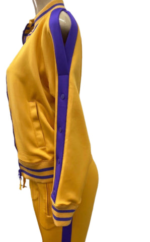 2 pc active wear set with button details on sleeves and inside leg zipper at hem. Pants are a fitted style.