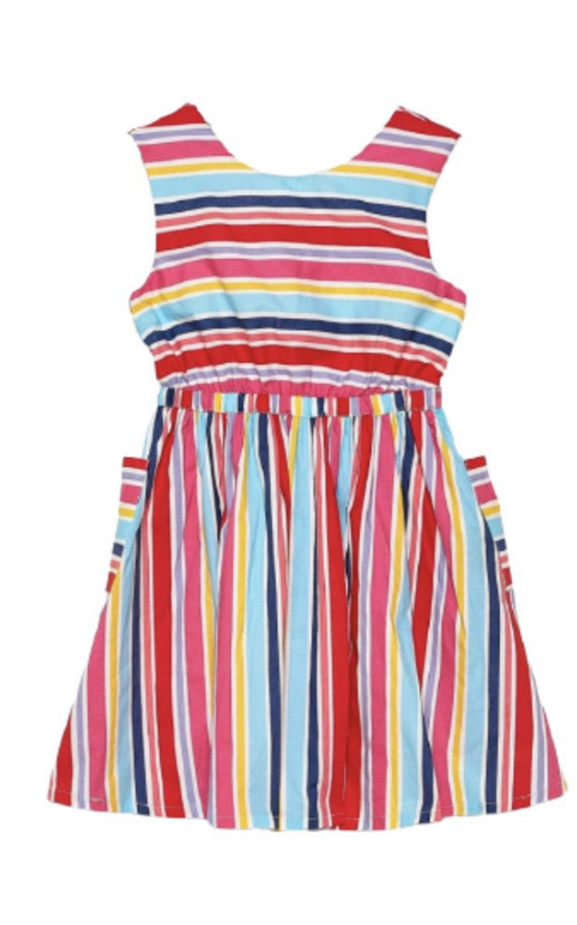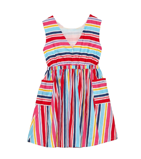 Our Candyland colorful striped dress has side pockets and a v neck sipper back. This dress will make your little one look and feel special