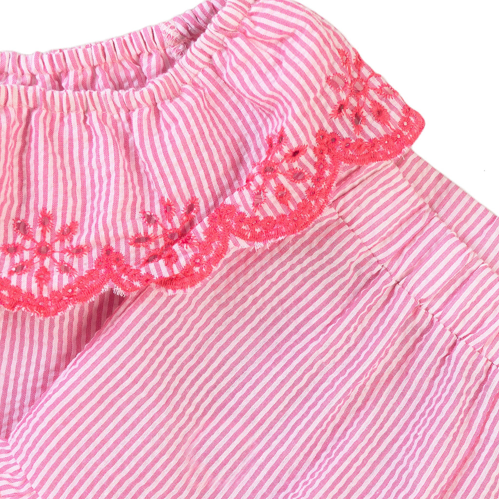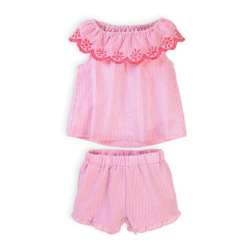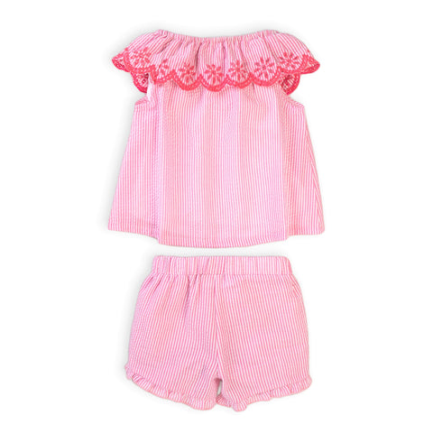 2 piece pink and white striped seersucker set with embroidered details. Top can be worn on or off the shoulder