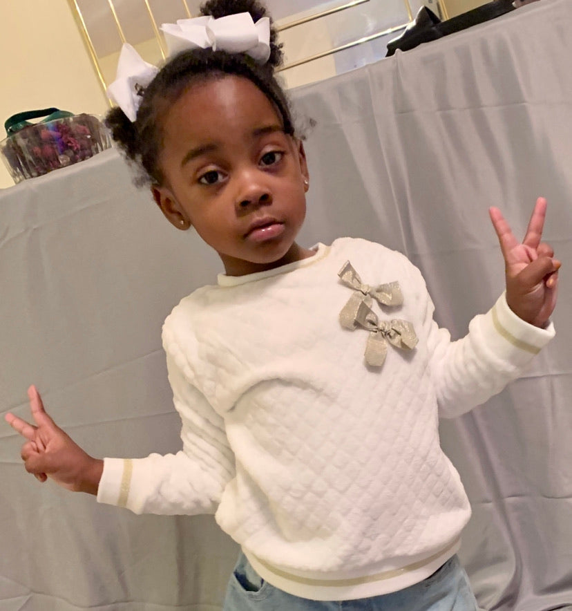 Soft fleece sweater with gold trim and glitter bows