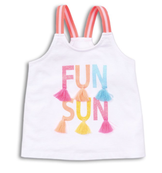 "Fun Sun" top with colorful tassels hanging from each letter